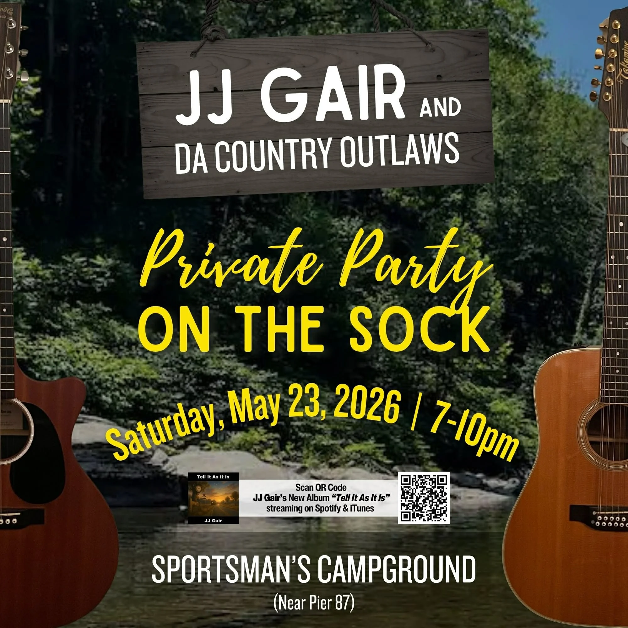 JJ Gair and Da Country Outlaws will be performing at a Private Party on the Sock at Sportsman's Campground (Near Pier 87) on Saturday, May 23, 2026, from 7:00–10:00 PM.