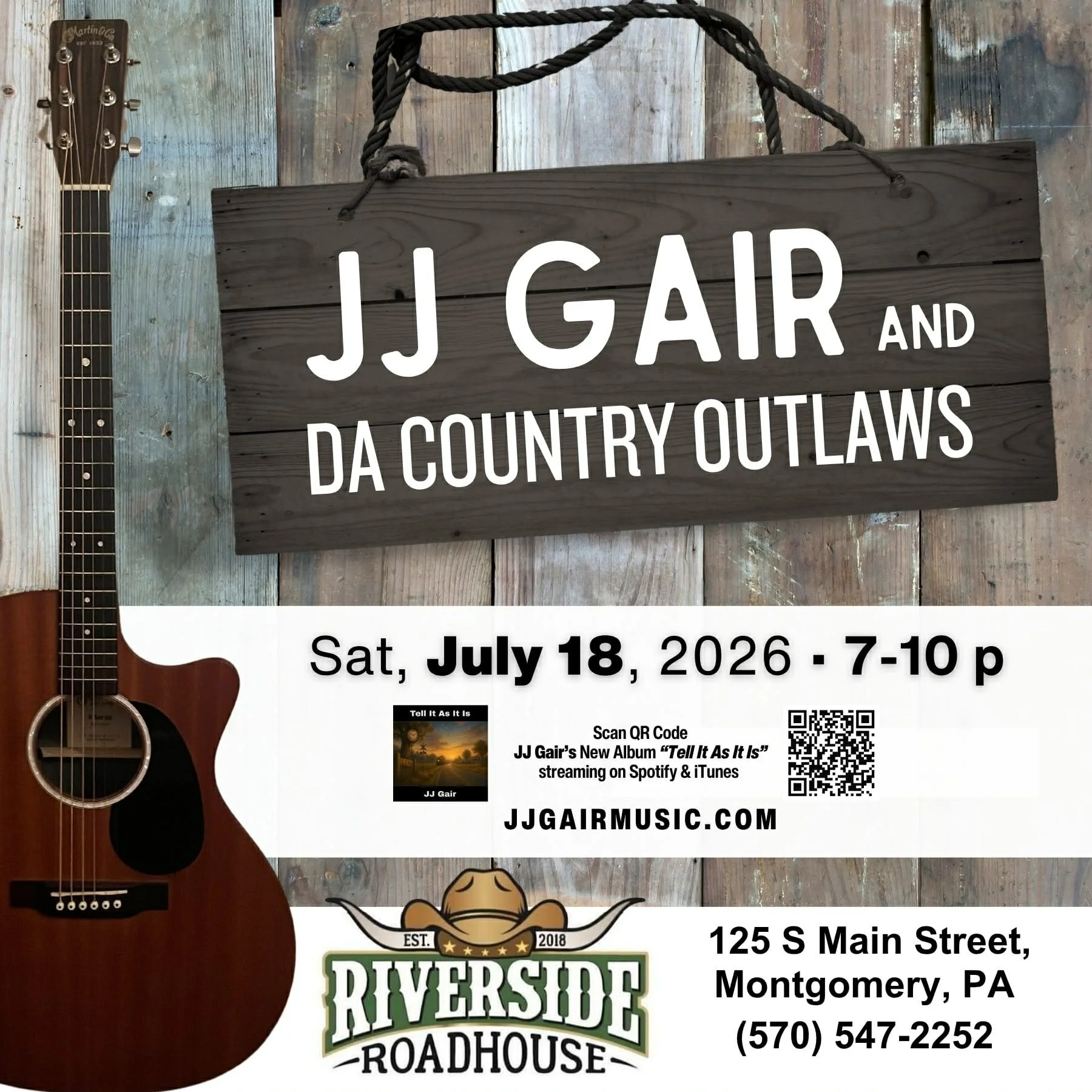 JJ Gair and Da Country Outlaws bring their high-energy country show to Riverside Roadhouse, featuring JJ's original songs along with classic country covers that keep the crowd on their feet and the room moving all night long. JJ's new album Tell It As It Is is now streaming on Spotify & iTunes.