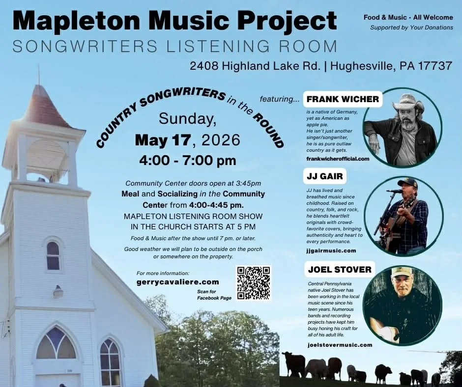 JJ Gair will be performing at the Mapleton Music Project Songwriters Listening Room in Hughesville on Sunday, May 17, 2026, from 4:00–7:00 PM.